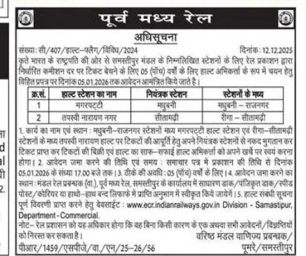 Railway Station Ticket Booking Agent Vacancy 2025 : Samastipur Division Halt Station Details