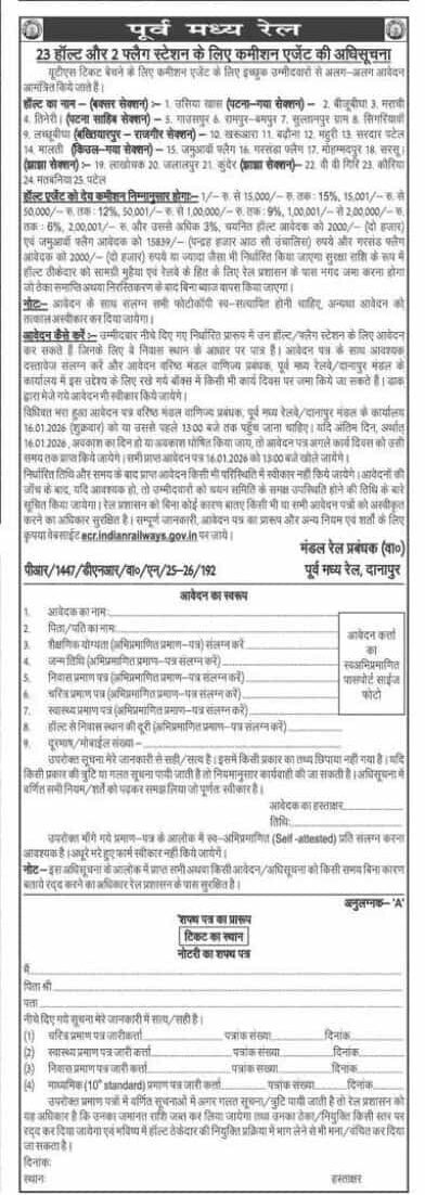 | Application Address | वरिष्ठ मंडल वाणिज्य प्रबंधक, पूर्व मध्य रेलवे, दानापुर मंडल |