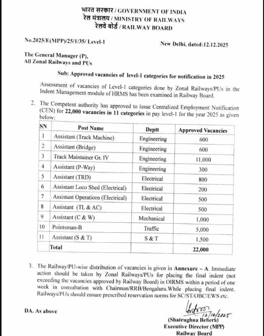 जबाव – आवेदक जो कि, रेलवे ग्रुप डी के पदो पर नौकरी प्राप्त करके अपना करियर सेट करना चाहते है उन्हें बता दें कि, RRB Group D New Vacancy 2026 के तहत रिक्त कुल 22,000 पदों पर बम्पर भर्ती निकाली गई है जो कि, आपके लिए रेलवे मे नौकरी पाने का बेहतरीन अवसर साबित हो सकता है।