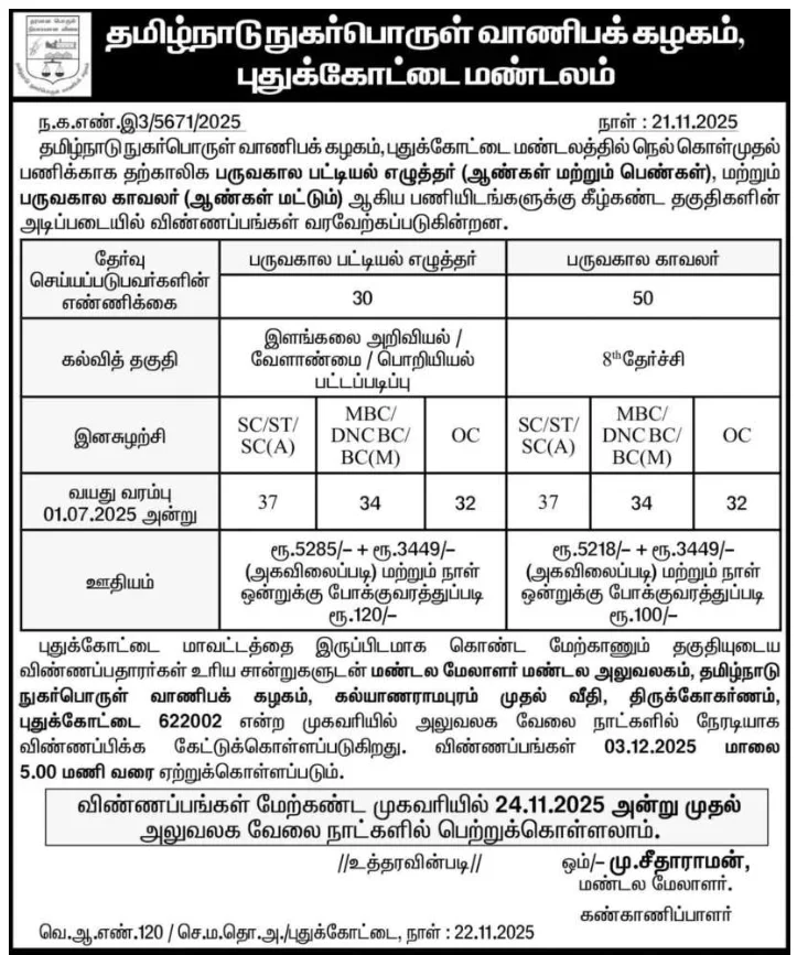 TNCSC Pudukkottai Recruitment 2025 का official notification जारी हो चुका है, जिसमें Listing Clerk और Watchman के लिए कुल 80 Seasonal Vacancies घोषित की गई हैं। अगर आप Pudukkottai district के निवासी हैं और government sector में temporary seasonal job की तलाश में हैं, तो यह आपके लिए एक शानदार अवसर है। आवेदन प्रक्रिया 24 November से 3 December 2025 तक सीधी offline mode में TNCSC Zonal Office में स्वीकार की जाएगी।